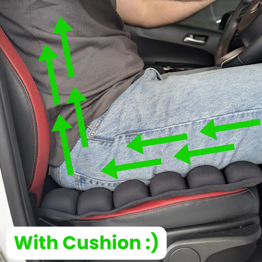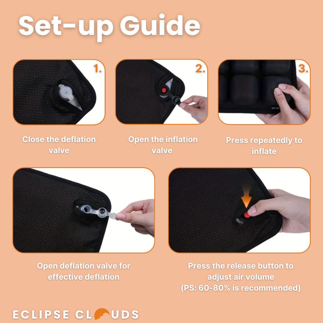 Less is more! For maximum therapeutic benefit, you want to feel like you're floating on a layer of air. Inflate it to around 80%, place it on your seat, and sit down. Then, slowly release air until you feel secured, supported, and comfortable.